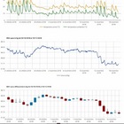 Descrizione: Propongo questa elaborazione dei dati di due alveari raccolti con le bilance B-Sens. La linea in verde riporta le temperature registrate alle ore 10. E' interessante notare come il peso sia rimasto sostanzialmente stazionario nei primi 5-6 giorni di fioritura dell'acacia per poi avere un deciso aumento nei rimanenti 4 giorni