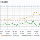 Descrizione: Dal 6 al 11 gennaio le temperature sono aumentate in modo sensibile. Si sono avute anche giornate soleggiate che hanno permesso alle api non solo di allentare il glomere ma anche di effettuare molti voli di purificazione. Dopo le giornate gelide di dicembre questo progressivo alzarsi delle temperature sembrava un invito alla natura di risvegliarsi. Alcuni alveari sono stati così indotti a iniziare l'allevamento della covata, in quelli monitorati con le bilance abbiamo infatti notato un progressivo e costante innalzamento delle temperature interne e i consumi notevolmente aumentati. In questa fase è bene sostenere gli alveari perché i consumi possono essere importanti e mettere in forte difficoltà le famiglie. Il previsto peggioramento meteo potrà quindi essere particolarmente pericoloso per i nostri alveari