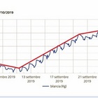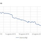 Descrizione: Grafico relativo al mese di settembre delle variazioni di peso dell'alveare campione posto nel nostro apiario didattico. Si evidenzia in particolare la notevole crescita di peso (per la stagione) in concomitanza di alcune fioriture particolarmente ricche nella zona come, ad esempio, l'Hedera helix
