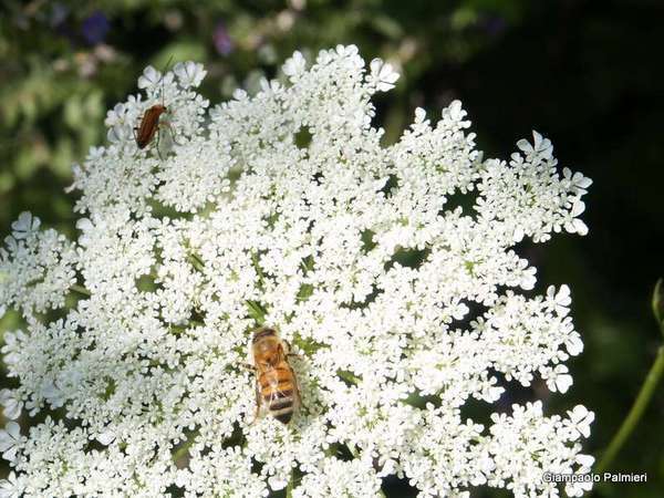 Descrizione: Non è molto frequente notare api sulle ombrellifere, come in questo caso. Spesso si tratta di sirfidi (ditteri che assomigliano alle api per mimetismo difensivo) eppure polline di ombrellifere è spesso presente nelle analisi melissopalinologiche dei nostri mieli
