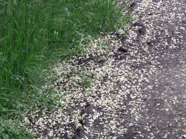 Descrizione: 15 maggio - dopo due settimane di piogge quotidiane le piante di Robinia pseudo acacia che erano già entrate in fioritura incominciano ora a perdere i fiori. Quanta tristezza vedere questi fiori disfarsi a terra!