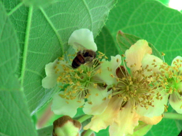 Descrizione: 5 giugno - le api visitano con un discreto interesse i fiori di questa pianta. Curiosamente nei Kiwi i fiori erano inizialmente ermafroditi e con una evoluzione regressiva ora si hanno piante maschili e femminili distinte. L'azione di fecondazione delle api è quindi, per queste coltivazioni, notevolmente importante