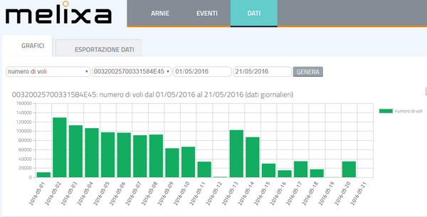 Descrizione: Con il Sistema Melixa si possono conteggiare il numero dei voli totali che in una giornata le api dell'alveare complessivamente compiono. Un dato molto interessante perché registra molto bene l'attività di un alveare in funzione dell'ambiente e dello stato della famiglia stessa. Da qui si intuiscono, ad esempio. le giornate con la pioggia e si può notare come la forza della famiglia, dopo la partenza di uno sciame il 14 maggio, si sia fondamentalmente dimezzata.
