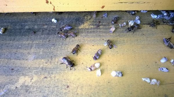 Descrizione: Fuchi e pupe di fuco morti alle porticine: un indizio di carenza alimentare (foto di Fabio Longhini). Anche l'amico Marco Bianchi segnala una situazione di criticità per il prolungarsi delle avverse condizioni atmosferiche: gli alveari che ha portato in montagna sono alla fame ed è già intervenuto con l'alimentazione di soccorso.