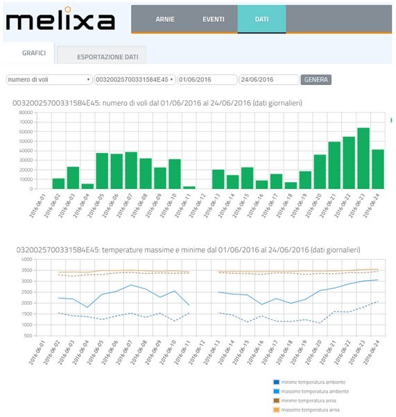 Descrizione: I grafici dell'alveare monitorato con il Sistema Melixa ci forniscono un quadro piuttosto preciso dell'andamento del mese di giugno a Sondrio. In particolare si nota che il momento di svolta è stato lunedì 20 luglio quando le temperature minime sono iniziate a crescere. Con esse è diminuito anche il divario fra temperatura esterna e quella che deve essere mantenuta per la covata e con ciò anche il consumo conseguente. Quei pochi giorni senza episodi di pioggia poi hanno risollevato gli alveari e sono via via cresciuti il numero dei voli e, conseguentemente, il peso dell'alveare.