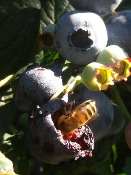 Descrizione: Le vespe riescono a rompere la resistente buccia dei mirtilli ed una volta sfamate abbandonano il frutto. Da questa lesione quale penetrano le muffe che provoca la fermentazione dei succhi zuccherini e la marcescenza del frutto. Le api, quando trovano un mirtillo od un acino d'uva lesionato succhiano tutti i liquidi zuccherini e lo asciugano in modo che i funghi non possono svilupparsi e proteggono così la produzione.