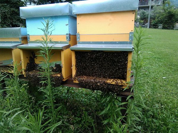 Descrizione: Gli alveari incominciano a perdere di peso perché le fioriture sono sempre più scarse. Le api inoperose formano queste barbe che, a sera, si ingrossano con le bottinatrici che riposano e preferiscono il fresco all'affollato e caldo nido.