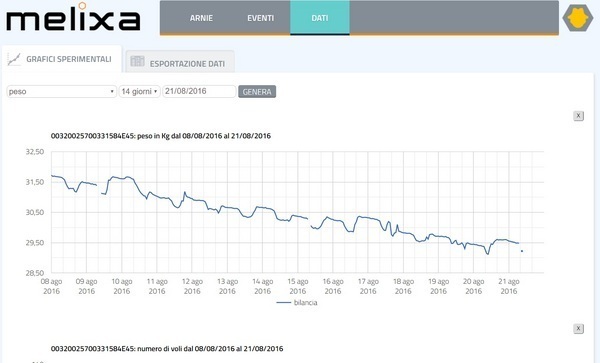 Descrizione: Il Sistema Melixa utilizzato dai tecnici dell'APAS ha rinnovato le modalità con cui vengono restituiti in forma grafica i dati rilevati. Reputiamo interessante pubblicare alcuni di questi grafici perché sono in genere di immediata lettura e danno un buon quadro dell'andamento produttivo di una determinata zona. Nel caso specifico si può notare come l'alveare campione ha perso, negli ultimi 14 giorni (ovvero da 7 al 21 agosto), circa 2Kg. Un dato in linea con tutte le altre nostre stazioni di rilevamento. Un campanello d'allarme importante che invita a sostenere con l'alimentazione gli alveari più sguarniti di scorte ed in particolare i nuclei.