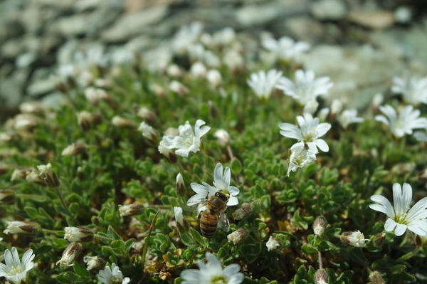 Descrizione: In questo periodo le fioriture presenti sul territorio sono molto scarse seppur sul fondovalle si cominci a notare qualche ape intenta a svolazzare intorno agli abbozzi fiorali dell'edera. In alta montagna, invece, alcune fioriture sono ancora presenti, ma le api si devono spingere molto in alto per raccogliere anche piccole quantità di nettare. Curiosa è l'immagine di un'ape, scattata sulla cima del Sasso Nero in Valmalenco (2921 m.s.l.m.), intenta a raccogliere nettare da fiori del genere Cerastium.