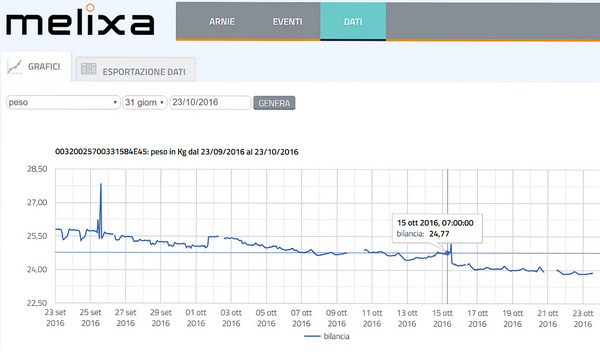 Descrizione: Le variazioni di peso degli ultimi 31 giorni dell'alveare monitorato con il Sistema MelixaAutore: Melixa