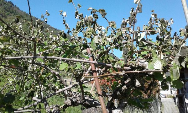 Descrizione: L'ondata di gelo che ha colpito l'Italia dopo Pasqua ha provocato molti danni in alcune zone della Valtellina. In campo apistico ha messo sicuramente in forse la possibilità di produrre miele di Acacia ma anche altri settori agricoli sono stati danneggiati: piante di Kiwi (Actinidia chinensis) e di Vite hanno i nuovi getti bruciati da gelo