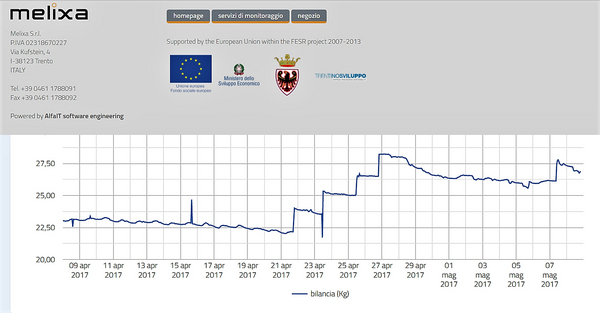 Descrizione: Andamento di peso di un nucleo negli ultimi 30 giorni. I 5 "gradini" registrati nel grafico sono ovviamente delle nutrizioni con sciroppo. Il trend, come si può osservare, è sempre piuttosto negativo. Senza delle nutrizioni di soccorso le famiglie deboli e i nuclei sarebbero fortemente in crisi