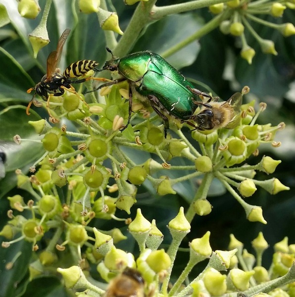 Descrizione: Grazie a Maria Giulia Romeri per questa bella foto di Edera (Hedera helix). L'immagine è molto eloquente: i racemi fiorali sono affollati di insetti di specie diverse perché il nettare e il polline di questa pianta sono molto appetiti ed inoltre non ci sono ormai più molte altre fioriture interessanti. L'Edera è particolarmente diffusa nelle boscaglie e nei terreni marginali. Questa fioritura rappresenta per gli alveari in importante stimolo per la covata perché fornisce un apporto proteico basilare in quanto sinergico alle alimentazioni stimolanti fornite dagli apicoltori.
