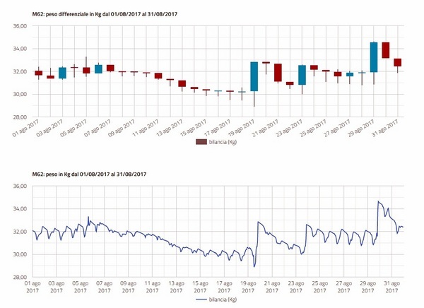 Descrizione: Si riporta il grafico dell'andamento del peso di agosto 2017 di un alveare monitorato con il Sistema Melixa per evidenziare i consumi e gli interventi effettuati con nutrizione stimolante per sostenere la ripresa delle covate dopo i trattamenti-tampone del periodo estivo