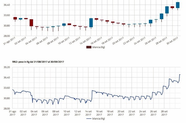Descrizione: Si riporta i grafico del mese di Settembre 2017 con l'andamento di peso di un alveare monitorato con il Sistema Melixa. Dal grafico si evincono i consumi del periodo e gli interventi nutrizionali effettuati con sciroppo per integrare le scorte e sostenere la deposizione delle covate.