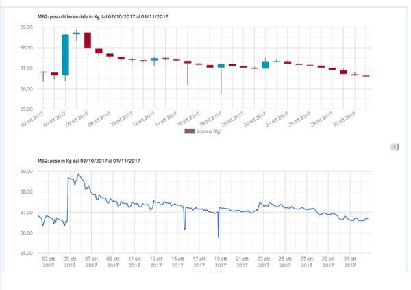 Descrizione: Si riporta i grafico del mese di OTTOBRE 2017 con l'andamento di peso di un alveare monitorato con il Sistema Melixa. Dal grafico si evincono i consumi del periodo e gli interventi nutrizionali effettuati.