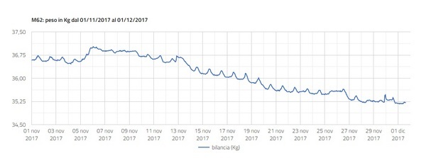 Descrizione: Pubblichiamo il grafico realizzato con il Sistema Melixa dell'andamento di peso di un alveare campione nel mese di Novembre 2017 - Loc. Montagna in ValtellinaAutore: Sistema Melixa -Giampaolo Palmieri