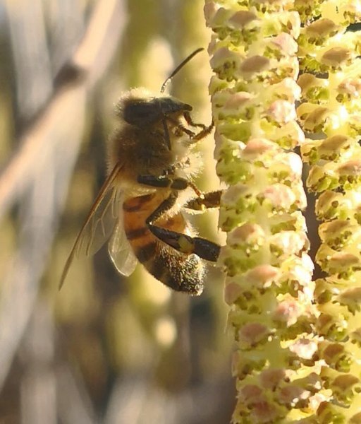 Descrizione: Quest'anno assistiamo ad una fioritura prolungata del nocciolo. Lo sviluppo degli alveari è fortemente potenziato da questa fioritura che fornisce il polline necessario alla crescita delle covate. In questa bella foto di Mauro Diana un ape intenta nella raccolta di polline sugli amenti del nocciolo (fiore maschile)