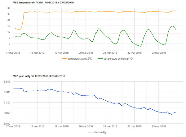 Descrizione: Molto interessante il grafico del Sistema Melixa della settimana dal 17 al 23 marzo: una perdita secca di 2 Kg in meno di sette giorni. Curiosamente si conferma, anche questa settimana, che in questa stagione gli alveari perdono ancor pił peso quando le giornate sono soleggiate