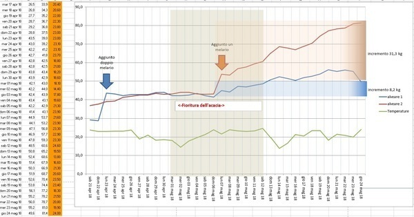 Descrizione: Questo grafico, realizzato utilizzando i dati raccolti da una bilancia doppia B-Sens ci permette di fare alcune considerazioni. La Fioritura dell'acacia, in questa postazione nei pressi di Sondrio, è iniziata il 1 maggio ed è durata, all'incirca una decina di giorni. Le api hanno poi seguito la fioritura che a mano a mano interessava la vegetazione a quote sempre maggiori. Le piogge di questo periodo, per quanto frequenti e, in alcuni casi di forte intensità, non hanno fatto perdere memoria ovvero "l'aggancio" con questa fioritura che risaliva le pendici. Le famiglie hanno così continuato a crescere di peso con un buon ritmo per molti giorni. La robinia ora si trova in fioritura solo alle quote più alte e quindi c'è una sensibile flessione nella raccolta. L'alveare 1, più debole, con le ultime piogge, si è ora praticamente "sganciato" da questa raccolta. Non trovando però, nell'immediato una fioritura alternativa interessante registra un sensibile calo di peso.
