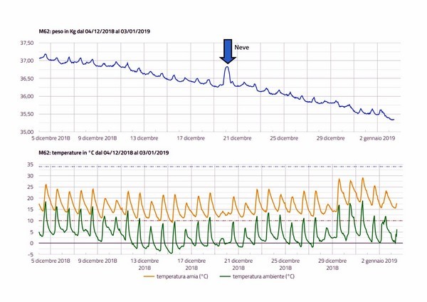Descrizione: Come è andato il dicembre 2018? La stazione di rilevamento del Sistema Melixa, da qualche mese, è stata spostata presso il nostro Cento didattico, una zona particolarmente calda e soleggiata come si evince dai grafici delle temperature. Le miti temperature inducono le api ad uscire di più durante il giorno e la sera le temperature si sono spesso abbassate sotto lo zero. In sostanza è una zona con una escursione termica piuttosto marcata e quindi con un consumo medio più elevato rispetto ad alveari posti in zone più fredde