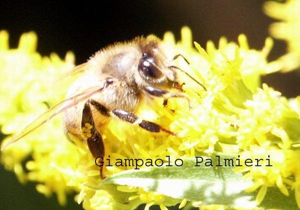 Descrizione: Berbenno, loc. S. Pietro quota 300 m. Fioritura della Solidago sativa. Le api visitano attivamente questa fioritura e non è raro trovare più individui intenti nella raccolta sullo stesso grappolo fiorale.