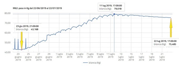 Descrizione: Possiamo mostrare uno dei grafici più significativi raccolti quest'anno con il sistema di Monitoraggio Melixa. Il nostro alveare campione attesta che la raccolta produttiva, a Sondrio, è iniziata il 23 giugno e si è dimostrata intensa: in 19 giorni ha registrato un incremento di peso di 36 Kg (ovviamente non sono tutte così!!). Poi dal 11 di luglio ad oggi (22 luglio) ha perso poco più di 3,5 Kg. Sul fondovalle della Valtellina sono ormai poche le zone dove il saldo fra consumo e raccolto è ancora positivo.
