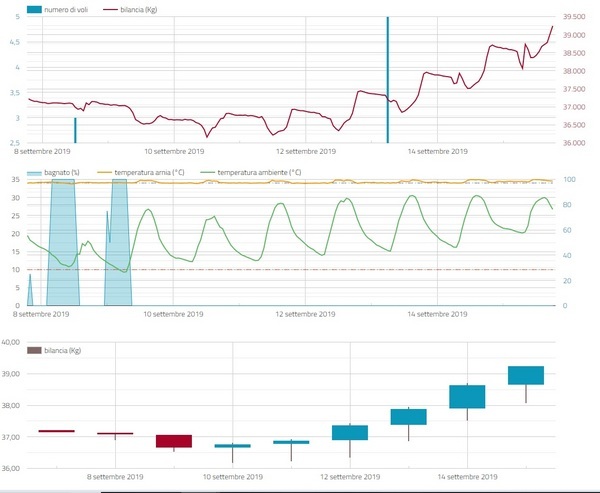 Descrizione: Il Sistema Melixa ha registrato un calo deciso e costante di peso dell'alveare campione. Una modesta e incerta ripresa nei primi giorni di settembre è ritornata subito in campo negativo con alcuni giorni di pioggia e di repentino abbassamento termico (con una minima, a Sondrio e di primo mattino, sotto i 10° lunedì 9 settembre). Quel momento è pressoché coinciso con il cessare delle piogge, con tempo sereno e con il crescere delle temperature. Diverse fioriture sono attive e le api riescono a trovare più fonti di approvvigionamento e così gli alveari tornano a crescere e sono stimolati ad allevare covata per avere consistente popolazione invernale. Il peso minimo è stato registrato alle ore 12 del 10 settembre con Kg 36,16 mentre oggi 15 settembre alle ore 18 registra Kg 39,24!!
