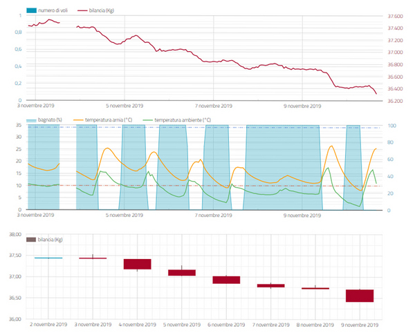 Descrizione: Di particolare interesse questo grafico che mette in rilievo il cambiamento climatico in atto divenuto decisamente autunnale. Le frequenti piogge hanno ridotto in modo drastico alle api la possibilità di uscire dal nido. Poche anche le ore in cui si sono avute temperature dell'aria superiori ai 10 gradi (e siamo in uno dei posi più soleggiati e caldi di Sondrio!!!). Le famiglie sono quindi state in glomere e questa notte le temperature sono scese intorno allo 0°. L'andamento molto fluttuante della temperatura interna dell'alveare dimostra che non c'è più covata. La famiglia ha comunque un sensibile consumo data la consistenza della popolazione.
