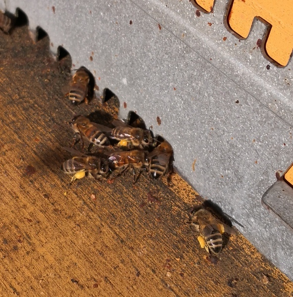 Descrizione: 3 febbraio 2020 - Le giornate calde degli ultimi giorni e la fioritura del nocciolo hanno risvegliato pienamente le famiglie che mostrano una intensa attivitą alle porticine. Una bella foto di Mauro Diana di api "bottinatrici" che rientrano cariche di polline