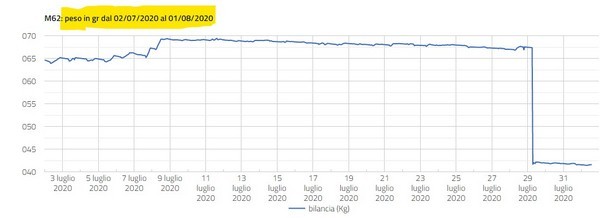Descrizione: Il Sistema Melixa ha registrato le variazione di peso di un alveare posto nel nostro Centro di Didattica Apistica ed Ambientale presso l'Istituto di Agraria di Sondrio. Le variazioni di peso risultano poco evidenziate perché il grafico, dovendo registrare la levata del melario, ha dovuto utilizzare una scala che ha appiattito tutto il resto. Si può comunque notare la sostanziale coincidenza di andamento delle variazioni di peso pubblicata quasi quotidianamente grazie a Marco Moretti. La raccolta, in entrambi i siti di rilevamento, è terminata intorno al 7 luglio, leggermente in anticipo rispetto allo scorso anno.