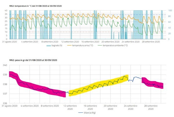 Descrizione: Il grafico di Melixa mette in rilievo che la perdita di peso degli alveari che ha caratterizzato agosto è proseguita anche nella prima decade di settembre. Le fioriture dell'edera e di altre essenze hanno poi fatto cambiare rotta ed hanno sostenuto gli alveari. Le recenti piogge sembrano però aver chiuso questo trend positivo.