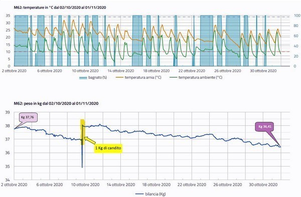 Descrizione: Pubblichiamo il grafico delle variazioni di peso dell'alveare campione posto nell'apiario del Centro di Didattica Apistica ed Ambientale dell'APAS. In questo alveare è ancora presente della covata ma il sensore di temperatura è all'esterno di tale area