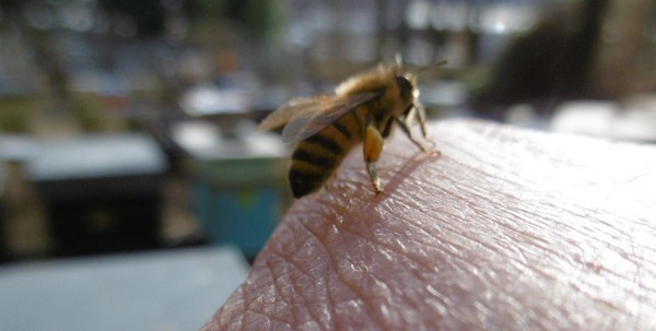 Descrizione: Si notano già api cariche di polline, sono api vecchi e affaticate, spesso devono portarsi piuttosto lontano per questa raccolta e quindi è facile vederle appoggiate da qualche parte a riposare per raccogliere le forze per ritornare all'alveare