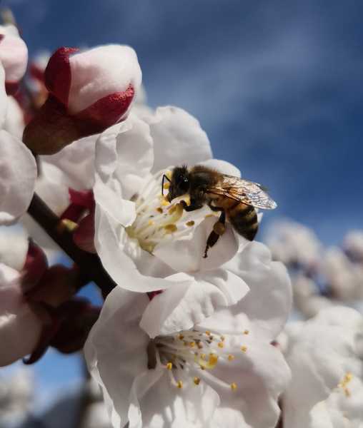 Descrizione: Una bella foto di Mauro Diana di api su albicocco fiorito