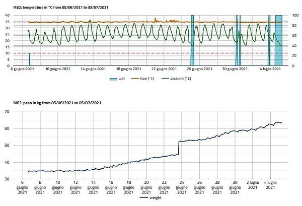 Descrizione: Il Sistema Melixa ha registrato le variazione di peso di un alveare campione posto nel nostro Centro di Didattica Apistica ed Ambientale presso l'Istituto di Agraria di Sondrio. Nel grafico si nota che l'incremento di peso dell'alveare si registra intorno al 12 giugno, accelera quindi la crescita per avere una flessione subito dopo la posa del melario, fra il 24 e il 26 giugno per la siccità e il vento caldo. Le piogge poi permettono una ripresa del raccolto.