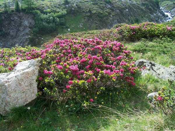 Descrizione: Le giornate calde hanno sviluppato più rapidamente la fioritura del rododendro. Così in pochi giorni porzioni sempre più ampie e quote sempre maggiori sembrano svegliarsi alla primavera alpina che ha, proprio nel rododendro il suo vessillo