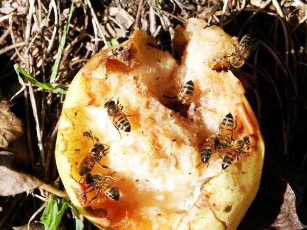Descrizione: settembre - api che raccolgono i succhi zuccherini da un frutto caduto e parzialmente mangiato dagli uccelli. Una vista abbastanza frequente ma che ha fatto credere per lungo tempo agli agricoltori che le api fossero responsabili di danneggiamenti all'uva e ad altra frutta matura.