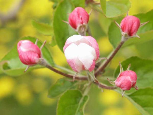 Descrizione: La fioritura del melo (Malus domestica). Qui è ritratto un mazzetto fiorale: dalla fase “bottoni rosa” alla schiusura del fiore centrale. E’ la condizione media dei frutteti di questa zona. Sfuocato e di sfondo il giallo dei fiori di tarassaco
