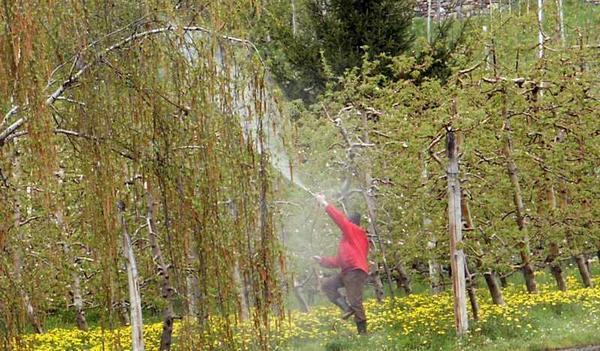 Descrizione: Un po’ nascosto da un ramo di betulla si nota un frutticoltore che tratta il suo frutteto. La sottostante fioritura di Tarassaco (Taraxacum officinale) ne risulterà compromessa. Fortunatamente la giornata fortemente nuvolosa trattengono le api, almeno momentaneamente, da questa visita.