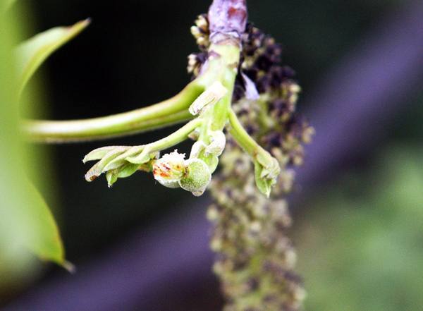 Descrizione: 1 Maggio - Il noce sta finendo la sua fioritura. Nell'immagine il fiore femminile in primo piano e quelli maschili (amenti) sullo sfondo. Raramente si vedono le api su questi fiori eppure il polline è spesso rintracciato nelle analisi melissopalinologiche.
