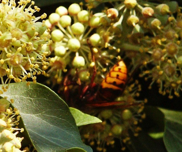 Descrizione: Molti insetti si affollano sull'edera in fiore. Fra questi anche la vespa carabro che con aria innocente sembra godersi un po' di dolce nettare ma non disdegna, in realtà, predare api ed altri insetti essendo, essenzialmente, carnivora.